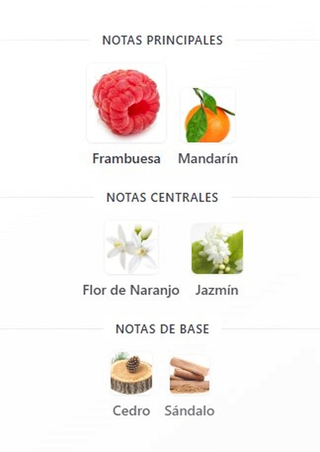 Su salida es fresca y jugosa, con un toque afrutado chispeante que transmite alegría y vitalidad. En el corazón aparecen flores delicadas que aportan feminidad y sofisticación. Finalmente, el fondo deja una estela cálida y seductora con vainilla y notas amaderadas, logrando un aroma equilibrado entre frescura y sensualidad.