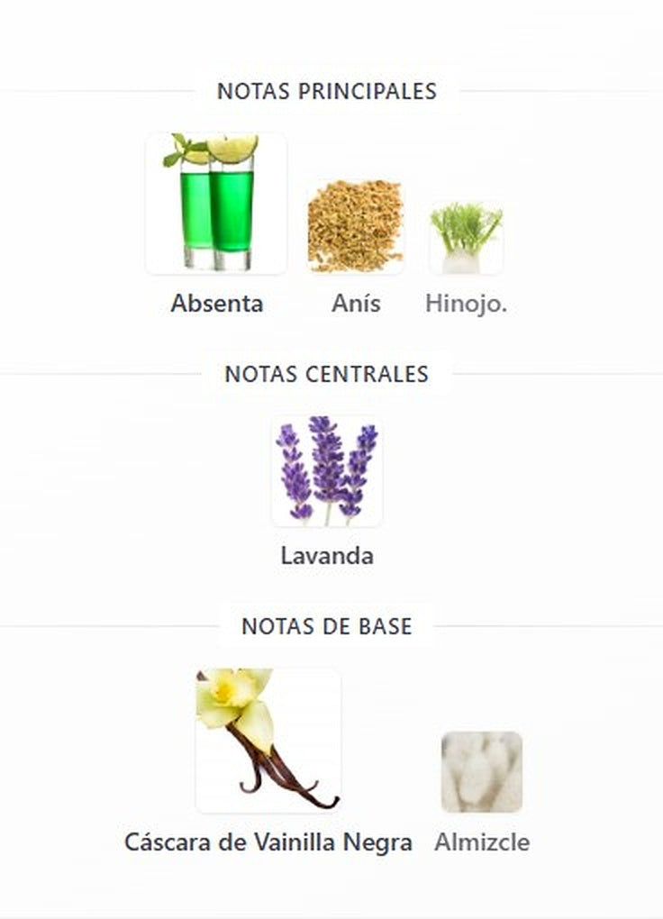 La salida es vibrante con un toque de absenta/anís que aporta un carácter diferente y misterioso. En el corazón se vuelve más elegante con lavanda, que suma limpieza y sofisticación masculina. El fondo revela su parte más sensual: una base cálida y adictiva con vainilla negra y notas ambaradas, dejando una estela potente, atractiva y con mucha presencia.
