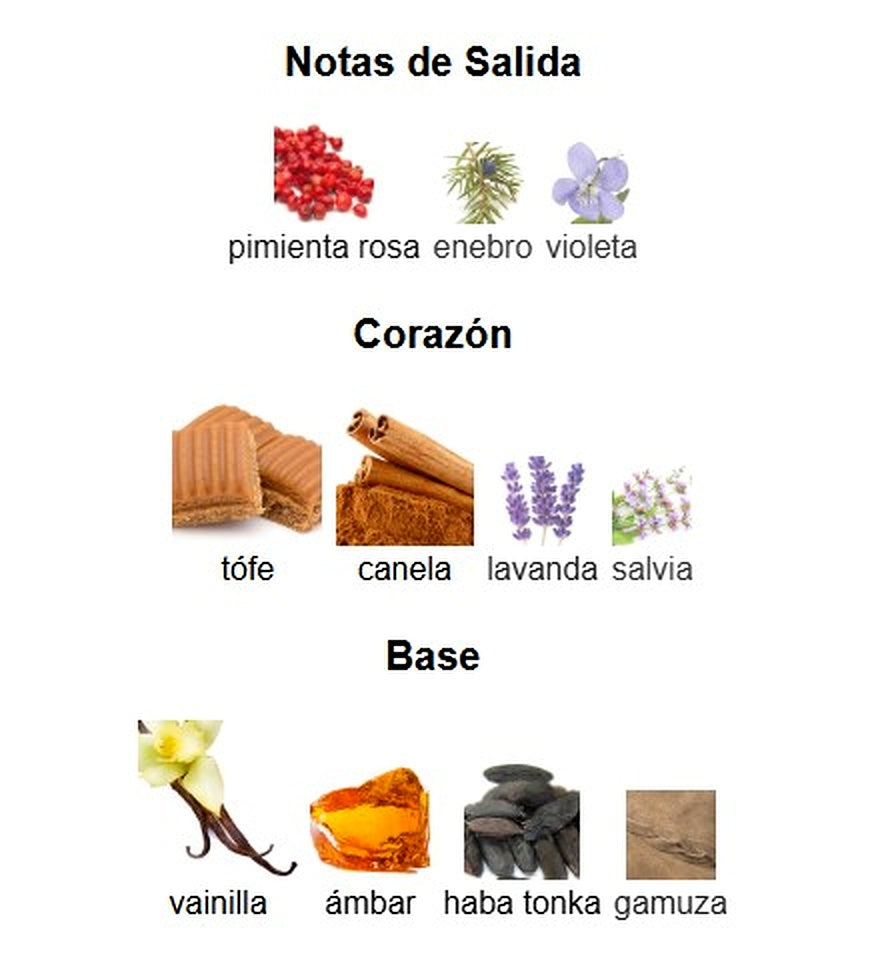 Su apertura combina la chispa especiada de la pimienta rosa con un acorde aromático elegante, mientras que el corazón revela una faceta gourmand envolvente donde destacan la canela y un toque dulce profundo. En el fondo aparece su firma más seductora: una mezcla cremosa de vainilla, haba tonka y un acorde ambarado que deja una estela poderosa, sensual y duradera.