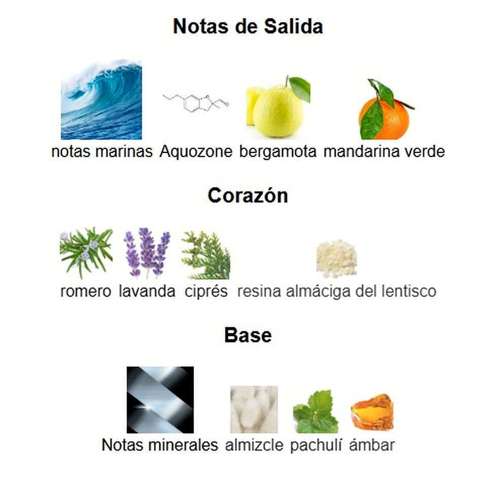 Su salida es vibrante y refrescante, con un frescor cítrico-acuático que evoca brisa marina y energía. En el corazón aparecen notas aromáticas que aportan estructura y masculinidad, mientras que el fondo se vuelve más profundo y envolvente gracias a maderas y almizcles, dejando una estela fresca pero con carácter.
